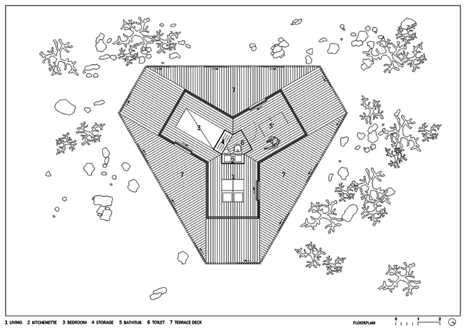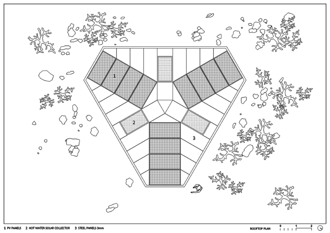 Este proyecto es una respuesta a las condiciones climáticas locales del desierto. Se trata tanto de un diseño pasivo como de la generación de energía renovable. La huella del edificio contiene todos los elementos que hacen posible la vida, desde la producción de energía hasta el tratamiento de las aguas residuales, al tiempo que mantiene un interior confortable, solo que rodeado de unas impresionantes e ininterrumpidas vistas de 360º.