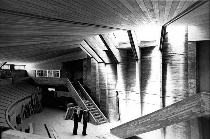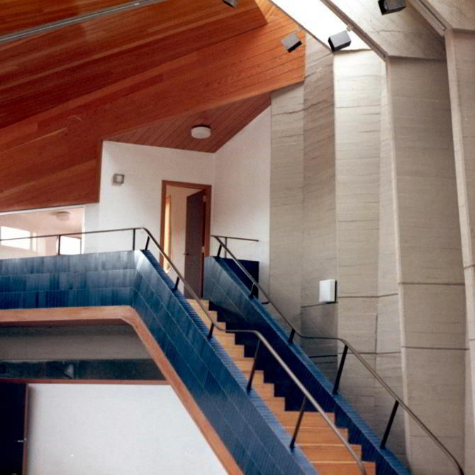 Unos grandes pórticos de hormigón constituyen el esqueleto estructural del gran vestíbulo, de doble altura, que se ilumina por el lucernario cenital, confiriéndole luminosidad y constituyendo este espacio el núcleo central del edificio.