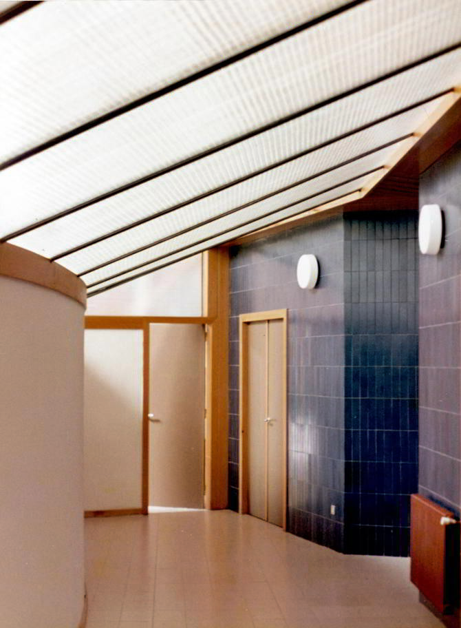Las aulas, aunque directamente conectadas al vestíbulo, disponen de un corredor dentro del mismo espacio, pero cerrado con un techo de cristal.