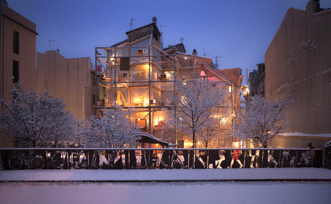 “Habitare” o el Hogar sin Casa es una instalación que se montó en Olot en noviembre de 2020 en el marco del Festival Luciérnaga. La génesis: el vacío causado por el derribo de una casa de vecinos del casco antiguo es ocupado por el andamio, necesario para reforzar las casas adyacentes.