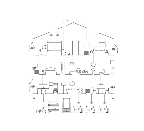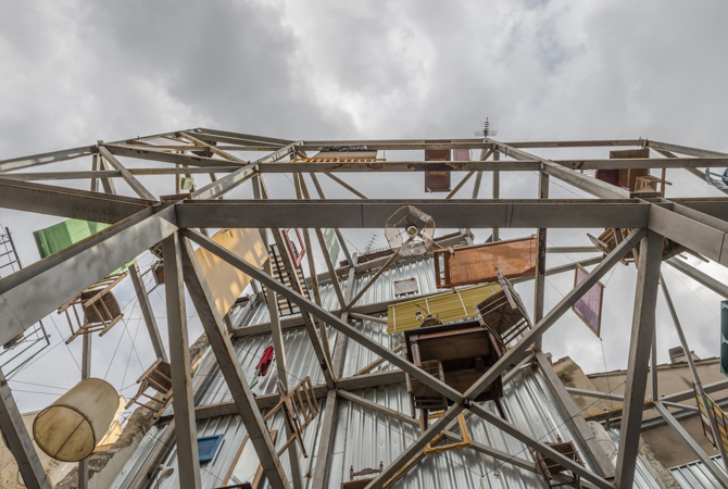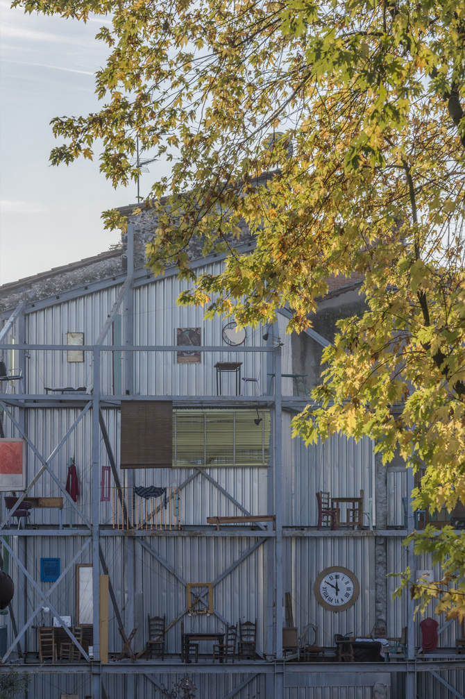 “Habitare” recupera los muebles que había en la casa, recuperados por toda la ciudad y precariamente restaurados, en una disposición similar a la existente. La instalación habita el andamio sin necesidad de construcción. Una instalación de luz y música hecha con las lámparas existentes recorre todos los pisos de la casa. La vida ha vuelto y permanecerá en el recuerdo mientras los muebles resistan la intemperie.