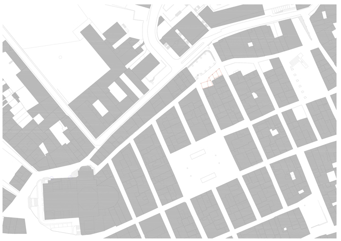 Este andamio sigue de una manera aproximada la geometría de la casa derribada con una estructura que es pura tectónica: barras verticales y horizontales sin ningún tipo de plementería.
