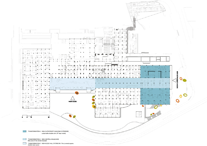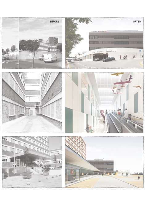 Espacio adicional adjunto a la fachada existente que conecta con el hospital con la calle, y que encima del mismo hall genera una terraza.
