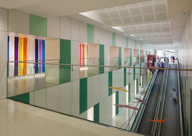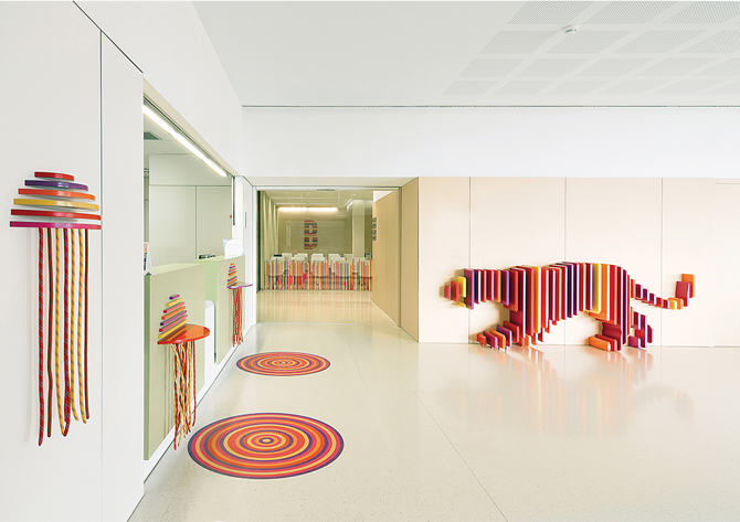 En el interior: la nueva área de bienvenida del hospital “El cuerpo humano”. Explosión de color. Formas sorprendentes. Claraboyas y luz natural. Juegos convencionales y digitales.