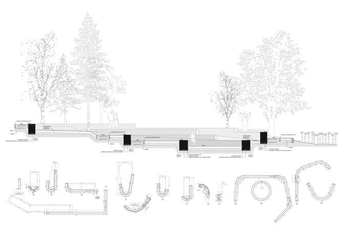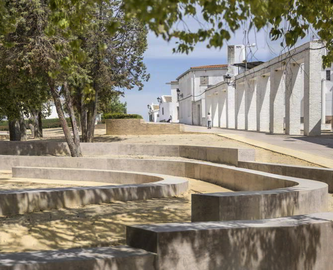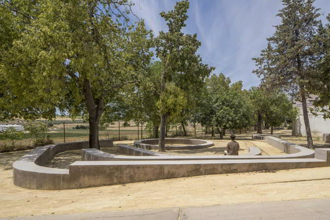 Los nuevos bancos de ladrillo y hormigón terroso recuperan la tradición constructiva local y dan forma a miradores, lugares de reunión y un graderío donde celebrar conciertos y actividades al aire libre durante primavera o verano –el llamado koilon en los primeros teatros griegos, cuando el teatro se construía aprovechando el terreno descendente en enclaves escarpados–.