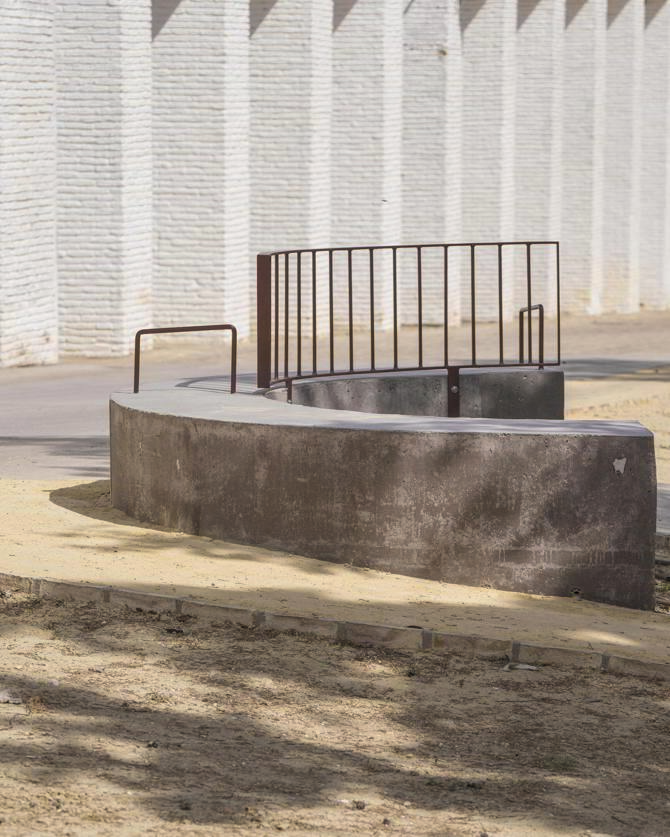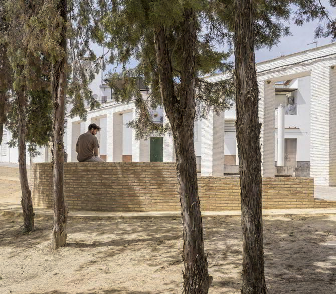 Se dota así al edificio existente en el emplazamiento de la Escuela Municipal de Música, de un espacio escénico sencillo pero efectivo. La intervención termina por establecer parterres donde continuar con la tradición agrícola del sembrado del girasol, como actividad paisajística ahora ligada a un espacio público de la barriada.