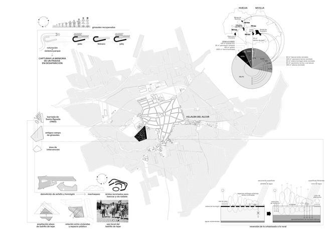 La actuación transforma un espacio vallado en estado de abandono perteneciente a un antiguo colegio en un parque público e isla ambiental en el límite urbano-rural, en la barriada de Santa Águeda, un crecimiento periférico de Villalba del Alcor rodeado de campos de girasoles. Se recupera el modo tradicional de arado del terreno, formando un sistema de caminos que siguen las trazas de surcos imaginarios en la tierra y se transforman según gira el sol, recuperando la memoria agrícola del lugar. Mediante una adecuación topográfica, se enlaza el parque con las viviendas de la barriada a través de un pórtico y una plaza existentes, invirtiendo la trasera del conjunto residencial en un nuevo espacio público.