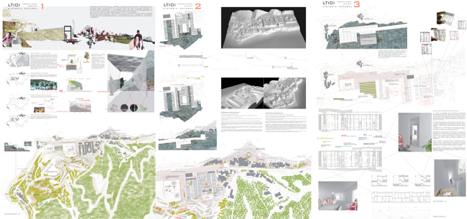 El nuevo barrio se entiende como contención del proceso de sedimentación bajo la ladera de la cantera, consolidando la explanación residual y estableciendo un nuevo plano de relación, la hibridación de arquitectura y paisaje se produce desde la morfología de la construcción.