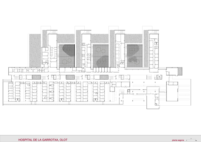 La propuesta se plantea como un edificio horizontal y escalonado adaptándose a la topografía natural del terreno, consiguiendo que todas las plantas estén en contacto con el suelo. El edificio se articula a partir de barras longitudinales en sentido este-oeste y “fingers” en sentido norte-sur, creando grandes patios ajardinados adaptados a la topografía. No se plantea un único volumen edificatorio, sino que se dispone de distintos espacios permeables.