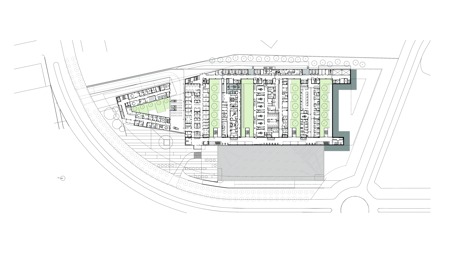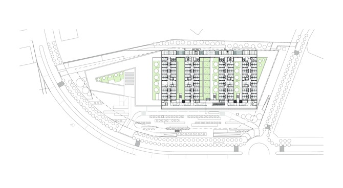 Este hospital fue planteado como un volumen horizontal, que se despliega por el terreno procurando acomodarse a la topografía para favorecer una contextualización adecuada del edificio con el entorno. Con el fin de controlar su gran escala frente a la escala urbana, la pendiente del solar se escalona, aligerando la volumetría, y, consecuentemente, se reduce el impacto visual del edificio.