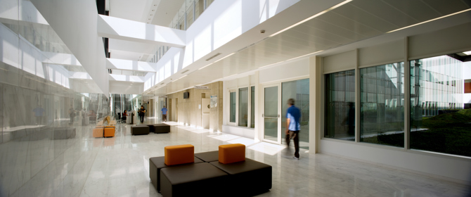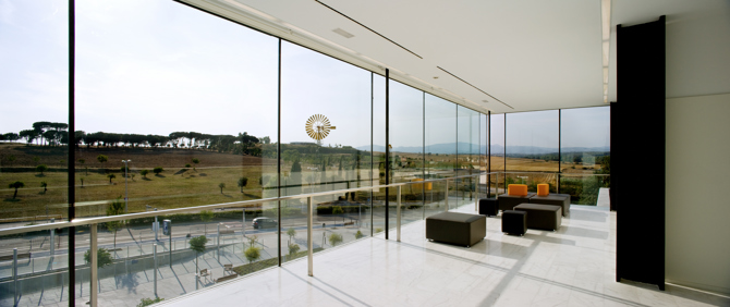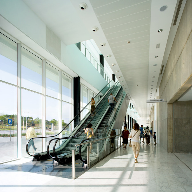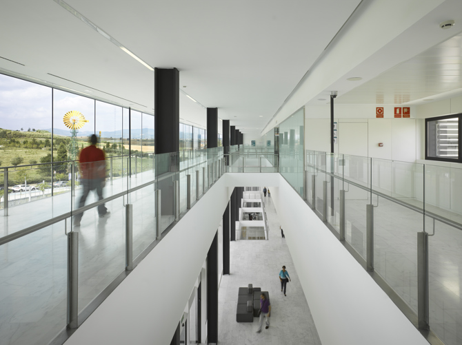 Los volúmenes se organizan alrededor de patios ajardinados que permiten la iluminación y ventilación naturales. El edificio se halla precedido de una plaza que se convierte en elemento fundamental en el diseño, ya que penetra hasta el interior del edificio, integrando una gran rambla de comunicación entre el interior y el exterior.