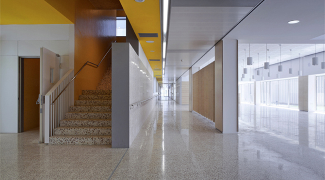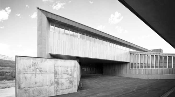 Un volumen con la fachada más larga orientada estrictamente al sur. Este volumen de sección trapezoidal está caracterizado por la pendiente de una única tejado que va de sur a norte, relacionando la gran tejado con la plaza de enfrente, organizando un espacio único que se relaciona con las montañas del entorno.