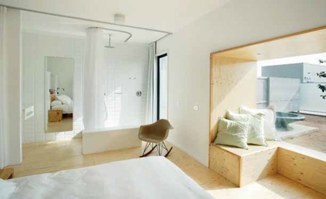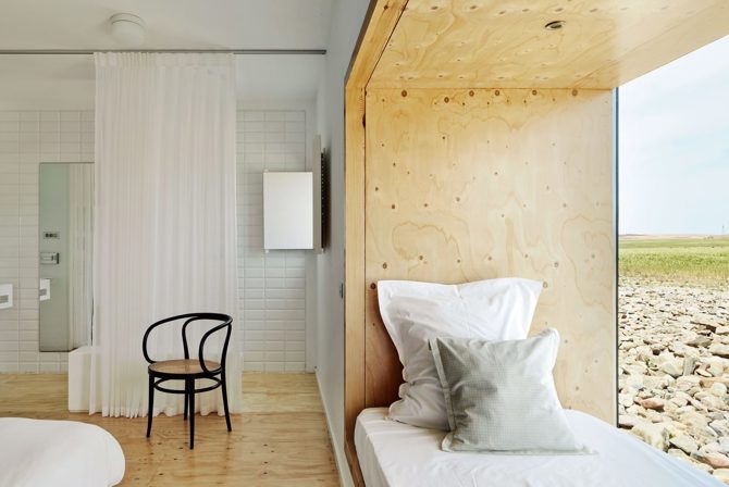 Para enfatizar la idea de las habitaciones como miradores protegidos, creamos unas ventanas salientes sin el marco de la carpintería visible desde el interior. La profundidad de la ventana se exagera y se reviste interiormente de madera contrachapada para ser ocupada. Este revestimiento esconde el marco de la carpintería y las cortinas tamizadoras y oscurecedoras enrollables que bajan motorizadas. De día la ventana se percibe como un simple hueco sin vidrio que crea una falsa percepción de grosor, no inherente a la construcción ligera utilizada.