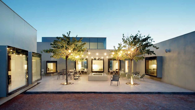 En medio de un imponente paisaje, con una presencia casi constante de fuerte viento, el hotel se concibe como una sucesión de espacios interiores protegidos y confortables para contemplar el exterior. Se trata de un hotel de cuatro estrellas ubicado en un campo de cultivo a 3 km del casco antiguo de Tudela y en la zona de influencia del Parque Natural de las Bardenas Reales de Navarra.