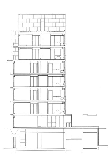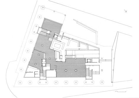 La planta baja se desarrolla mediante un porche en toda su longitud, que permite que los diversos episodios de la planta baja, tales como accesos al edificio y embocaduras de las calles, se produzcan en un discreto segundo plano. En las plantas superiores, las franjas definidas por los cantos de los forjados quedan delimitadas verticalmente por pilastras aplacadas de piedra, determinando unos entrepaños de dimensiones fijas, cuya resolución se confía a un mismo material.