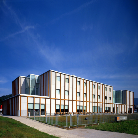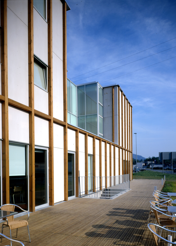 La imagen final se articula sobre la idea de un entramado vertical de pilares de madera laminada que modulan y organizan los paramentos exteriores, ventanas, etc. El entramado envolvente, a modo de fachada superpuesta, permite identificar el edificio en la distancia.
