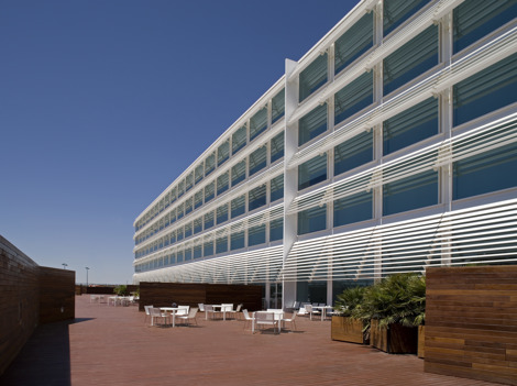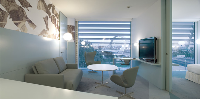 Las habitaciones del hotel se orientan al sur en un cuerpo largo y estrecho, con vistas al río, sus puentes y la ciudad. Orientadas al norte están las terrazas sobre los salones de banquetes que se iluminan a través de grandes patios con palmeras. Estos espacios exteriores se protegen del viento y de la calle de llegada al hotel con una gran pantalla escalonada de lamas de hormigón y ojos de vidrio. Esta pantalla organiza también la plaza para que peatones y vehículos se dirijan al vestíbulo exterior cubierto donde están las puertas de entrada.