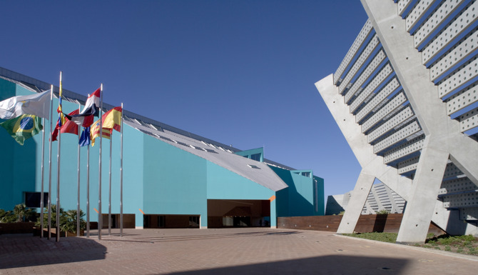 La fachada sur es una retícula de aluminio lacado en blanco que enmarca los cristales de suelo a techo de las habitaciones y de las dependencias de la planta baja, protegida del sol con lamas horizontales, también de aluminio. Los baños entraron completamente prefabricados en Portugal por la fachada y antes de colocar las cristaleras. Los grandes salones y todos los servicios generales del hotel, cocinas, almacenes, etc., se ubican en el nivel de los patios de las palmeras. En la planta baja se sitúan los restaurantes, el bar y las salas de la zona empresarial comunicados directamente con la terraza sur que es la cubierta del aparcamiento.