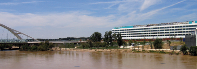 La piscina que comunica directamente con el spa de la planta inferior está colocada en el borde de la terraza frente al Ebro y disfruta del paisaje fluvial.