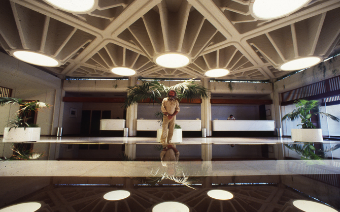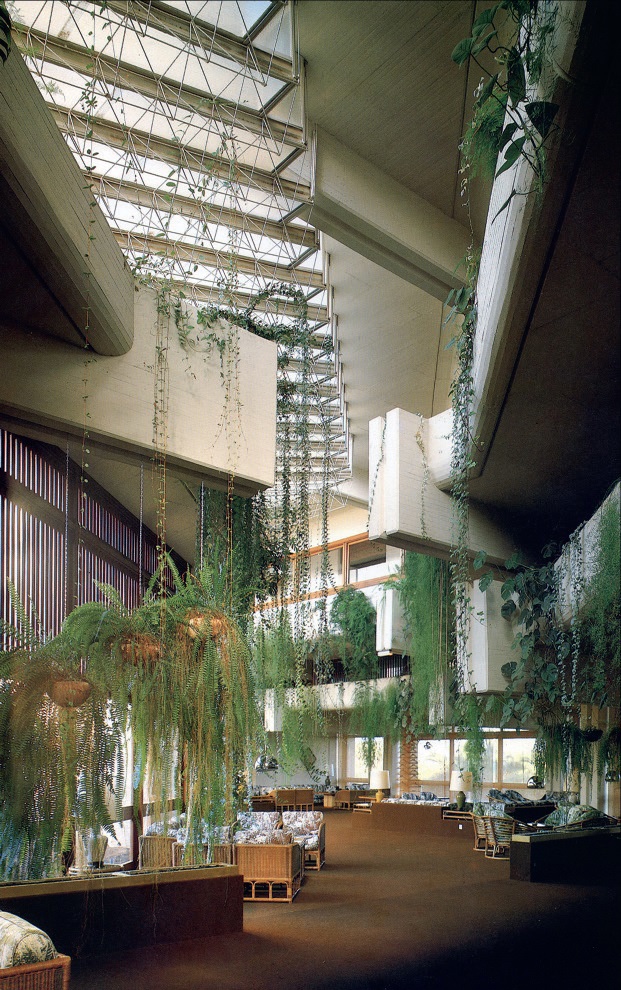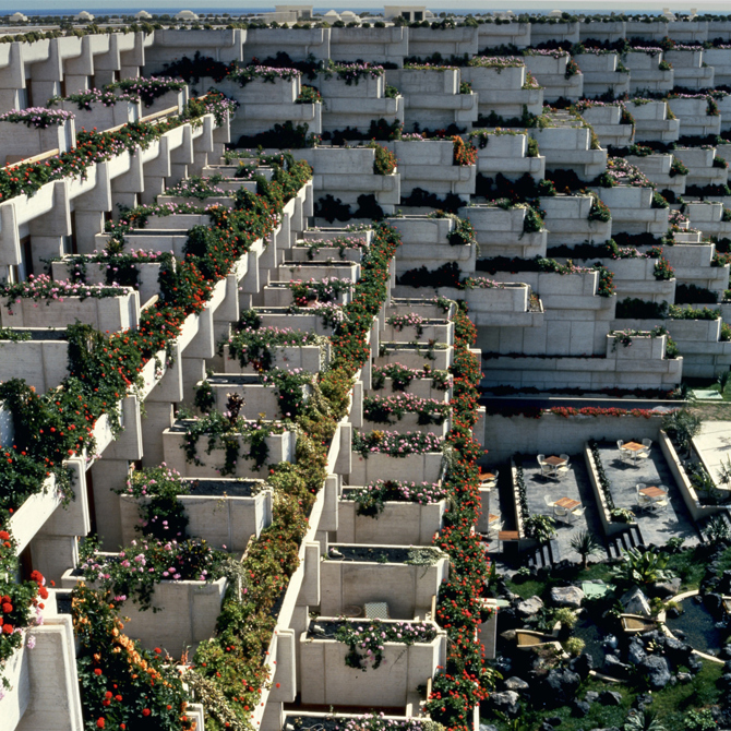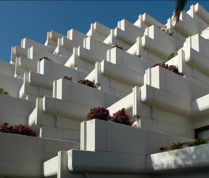 Tanto al interior como al exterior apenas existen otros materiales que el hormigón blanco de su estructura resistente, que constituye el 90% de su acabado. Están perfectamente diferenciadas las zonas de habitaciones de las sociales y de las de servicios comunes. No obstante, existe una interconexión total entre todas mediante un núcleo de comunicaciones situado en el centro de gravedad del edificio.