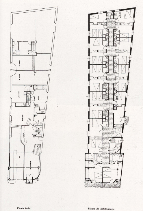 De este modo, se lograba que al observar el edificio lateralmente se perdiera todo punto de referencia con el que apreciar el ancho exacto de la fachada La estructura es mixta, de hormigón armado y ladrillo, fórmula muy económica y muy de acuerdo con el limitado presupuesto de que se disponía. En los sótanos, se han emplazado los servicios generales de calefacción y almacenes. En la planta baja, además de unas tiendas, existe la entrada del hotel y un bar con entrada independiente. En el resto de las plantas se distribuyen hasta cien habitaciones, todas ellas por lo menos con servicio de W. C. y lavabo.