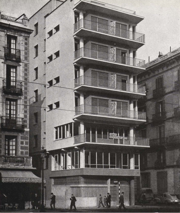 Cuando se proyectó el edificio, que está destinado a hotel, se pensó derribar previamente la edificación existente. Fue cuando nos preguntamos por qué tenía tan poca altura una construcción situada en un lugar tan antiguo y céntrico de la ciudad. Desagradable fue la sorpresa al descubrir que por debajo de la edificación, y a todo el largo de la misma, pasaba un canal de cuatro metros de ancho, conductor de las aguas procedentes del Rech Condal, una de las más antiguas instalaciones de aguas de la ciudad, cuya construcción se remonta a la Edad Media. Esta circunstancia, que no puede apreciarse exteriormente, fue la que determina totalmente la estructura del edificio, debido a los problemas de cimentación que ello origina. Tuvo que apoyarse el mismo por un lado sobre el muro del canal y, por el otro, a escasa distancia del mismo y sobre un terreno arenoso con el nivel del agua del mar, a 4,75 metros de profundidad. A la fachada principal, o sea, la de siete metros de ancho, se le han añadido todos los voladizos que las ordenanzas municipales toleran, para disimular su estrechez. Se ha procurado obtener una mayor amplitud de esta fachada, además, no limitando los voladizos por aristas verticales, sino por medio de una línea quebrada, como puede apreciarse en las fotografías.