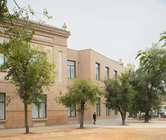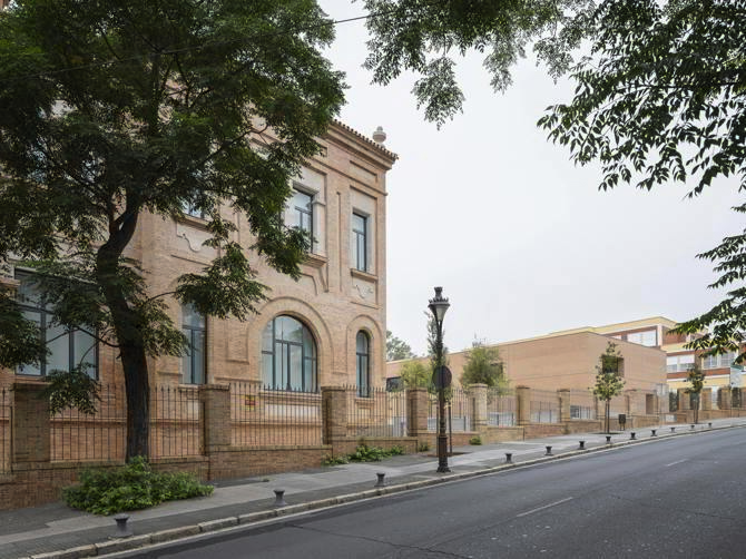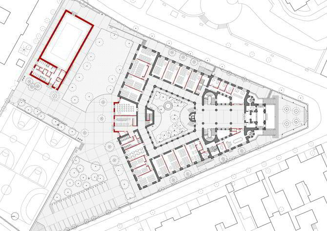 El edificio a rehabilitar, con una superficie construida aproximada de 7.500 m2, alberga un programa heterogéneo que debe adaptarse con la mayor naturalidad posible a innumerables singularidades espaciales y constructivas. Para evitar que la intervención se convierta en una sucesión de episodios inconexos definimos una clara sintaxis constructiva: una vez establecida una reducida paleta de materiales se fijan una serie de reglas que determinan cómo articular el encuentro entre los diferentes elementos, lo que permite responder a situaciones diversas (e imprevistas) de manera específica dentro de una relación de continuidad. Esta elección viene dictada tanto por la necesidad de atender a requerimientos ambientales y funcionales (resistencia, mantenimiento, luminosidad, acústica, etc.) de un modo pragmático, como por el deseo de hacer resonar el renovado interior con la memoria material del edificio: con los ladrillos aplantillados de fachada, los moldurados de las pilastras, la piedra natural y el terrazo, así como los imponentes árboles del patio.