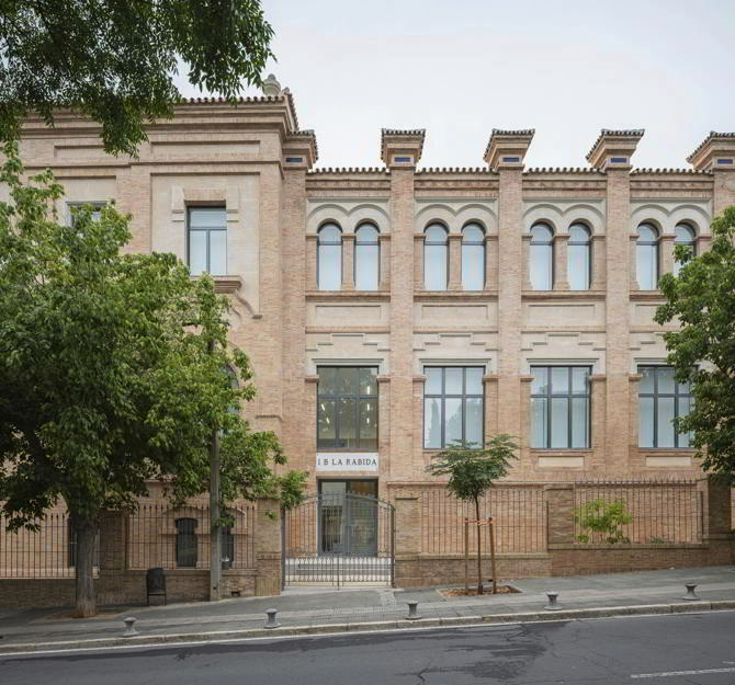 El nuevo gimnasio ayuda a ordenar los espacios exteriores, ejerciendo como articulación entre el IES la Rábida, el vecino IES Diego Guzmán de Quesada, y los diferentes ámbitos del patio de juegos. La solución material y compositiva de las fachadas establece un diálogo con el edificio existente, al tiempo que reclama autonomía desde la contemporaneidad de su lenguaje.