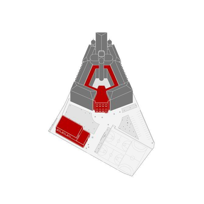 El edificio se encuentra compuesto por una serie de volúmenes yuxtapuestos —que varían en función del programa que estaban destinados a albergar— ordenados a partir de un potente eje de simetría. En su estado original, este hecho se traducía en una clara diferenciación espacial entre el uso estrictamente educativo, volcado al gran patio interior, y aquellos de carácter más público (vestíbulo principal, auditorio, capilla, biblioteca y administración), concentrados en la cabecera. Las intervenciones posteriores se desviarían de esta lógica, haciendo cada vez más confuso el funcionamiento del centro, por lo que una de las primeras decisiones de proyecto será recuperar la coherencia entre estructura espacial y funcional.