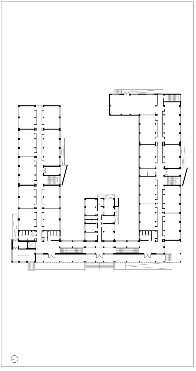 El edificio original presenta una tipología de peine en la que cada una de sus tres púas, orientadas en dirección este-oeste y de dos plantas, es de distinta longitud. La norte (mayor) y la sur (mediana) se destinan a las aulas en una distribución de pasillo central al que recaen los accesos a las mismas. La central (pequeña) se reserva para la administración. El elemento que cose las tres piezas opera como fachada, con un gran pórtico longitudinal al exterior y un vestíbulo al interior, ambos de doble altura. en éste último se alza una escalera abierta que conduce a la galería superior.