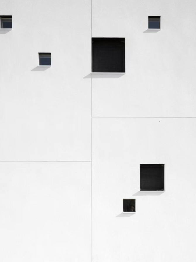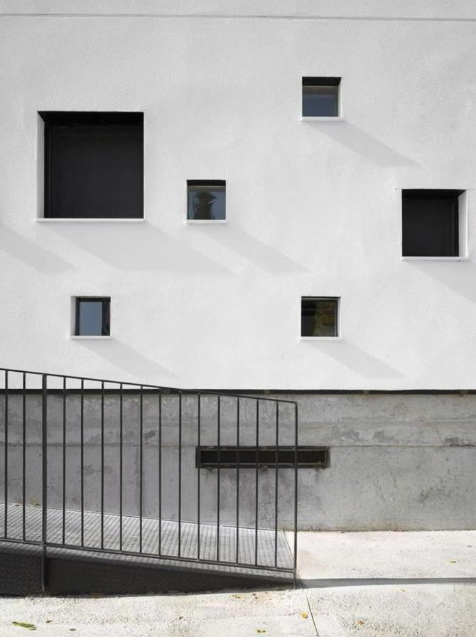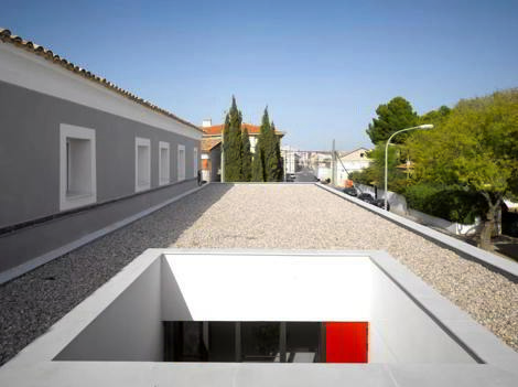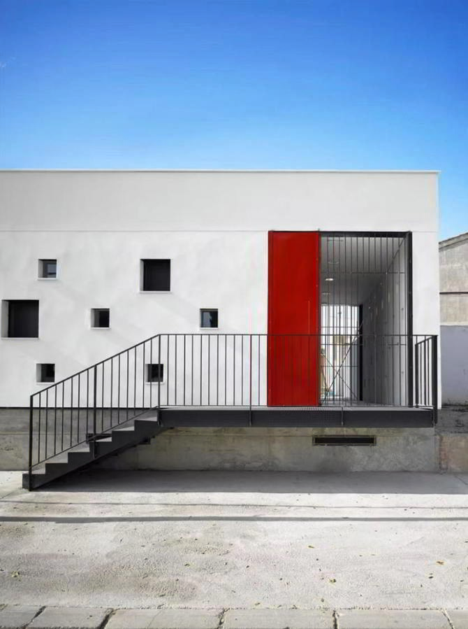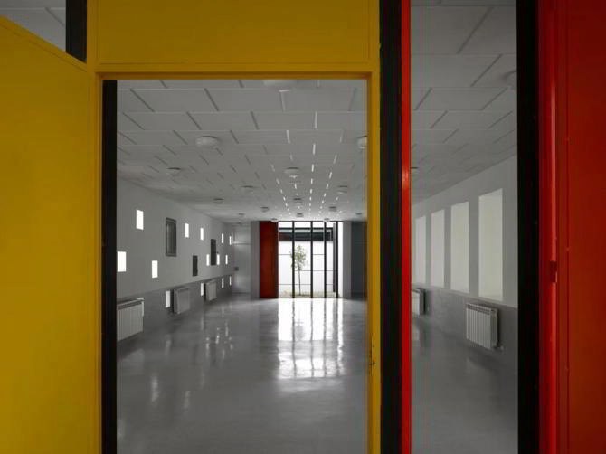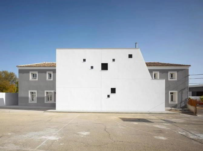 El prisma preexistente de monocapa gris y con los huecos recercados en blanco sirve de apoyo a la nueva intervención. Las nuevas piezas se ejecutan con estructuras ligeras, chapas metálicas perforadas, monocapa blanco, terrazo y grava. El patio del comedor y el diseño de los huecos en los paramentos garantiza la iluminación y ventilación naturales. El color rojo y amarillo se emplea en las puertas como código identificativo de los accesos principales del colegio.