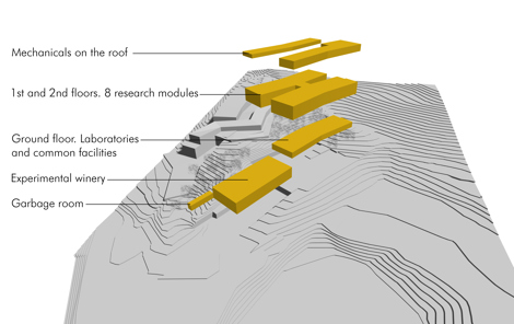 Se compone de tres volúmenes. Dos de ellos, simétricos, forman el edificio de investigación. Las dos plantas altas alojan laboratorios y despachos para más de 200 investigadores, repartidos en ocho módulos casi idénticos, mientras en planta baja se sitúan los laboratorios e instalaciones comunes. El tercer volumen, la Bodega Experimental, se dispone como prolongación del más bajo de los dos anteriores, adaptándose así a la caída de la ladera.