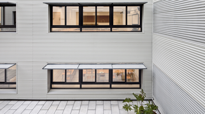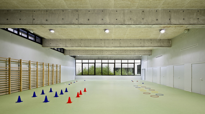 Mediante el vaciado de la forma, el proyecto genera 2 patios que, además de dotar de luz y ventilación a las aulas, crea un distanciamiento con las viviendas de la calle y, de este modo, consiguen la óptima privacidad para ejercer su actividad. Finalmente, con la intención de crear un espacio de acceso protegido del agua, el proyecto practica un tercero vaciado en esquina que hace de acogida y configura el perfil del edificio.