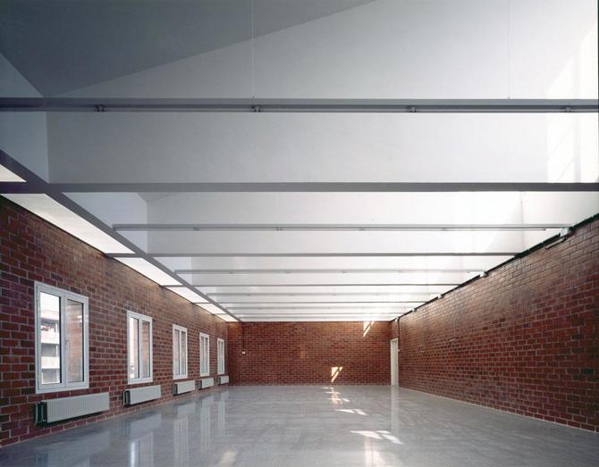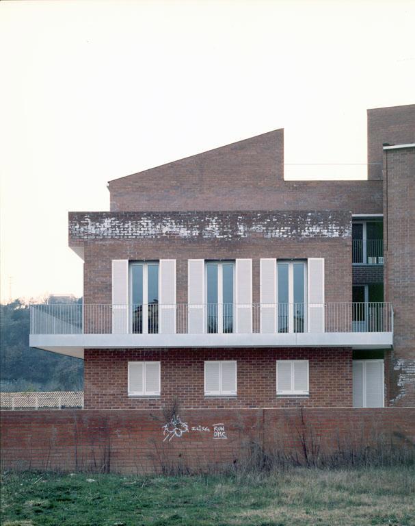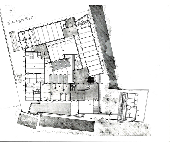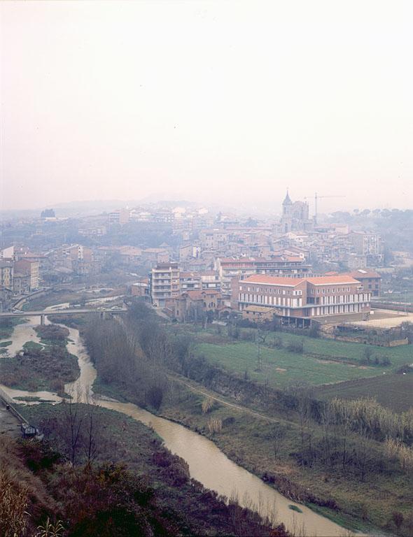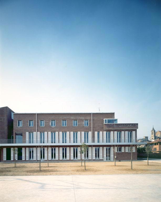 La escuela está situada en las afueras del pueblo, cerca del río y con buenas vistas en todas direcciones. El planteamiento del edificio, como volumen de planta cuadrada con un gran patio central, responde a estas condiciones. La disposición en torno al patio con cuatro volúmenes laterales que giran ligeramente y se abren a los diferentes lados permite también una correcta relación entre los pasillos y los espacios de trabajo.