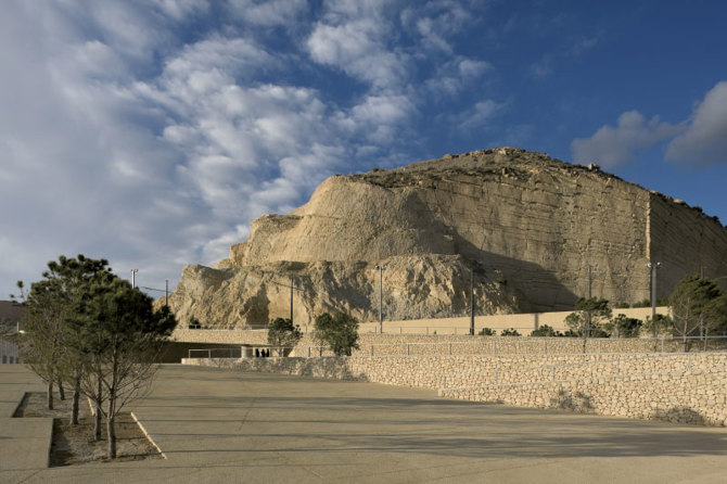 La intervención se realizó en un área ubicada al pie de la ladera de la Serra Grossa en Alicante, región de gran potencial paisajístico, cuyo carácter lo define la presencia de la avenida Villajoyosa y su pasado industrial. Los cortes de la montaña reflejan numerosas extracciones, llevadas a cabo en una cantera situada allí años atrás, y las improntas sobre la roca manifiestan las huellas de las naves de la antigua refinería Lo Británico.