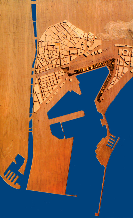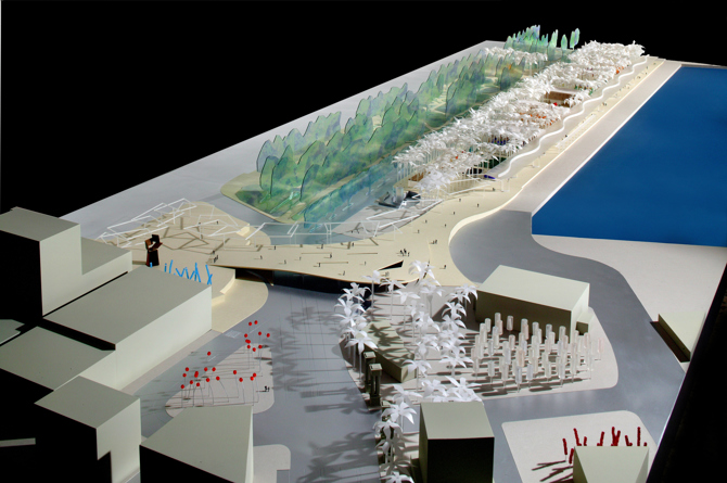 Una plaza mayor con forma de salón que se asoma al Mediterráneo, formalizada con tres elementos básicos: una trama isótropa de palmeras, una pérgola que discurre paralela al muelle y una lámina de conexión con la ciudad.