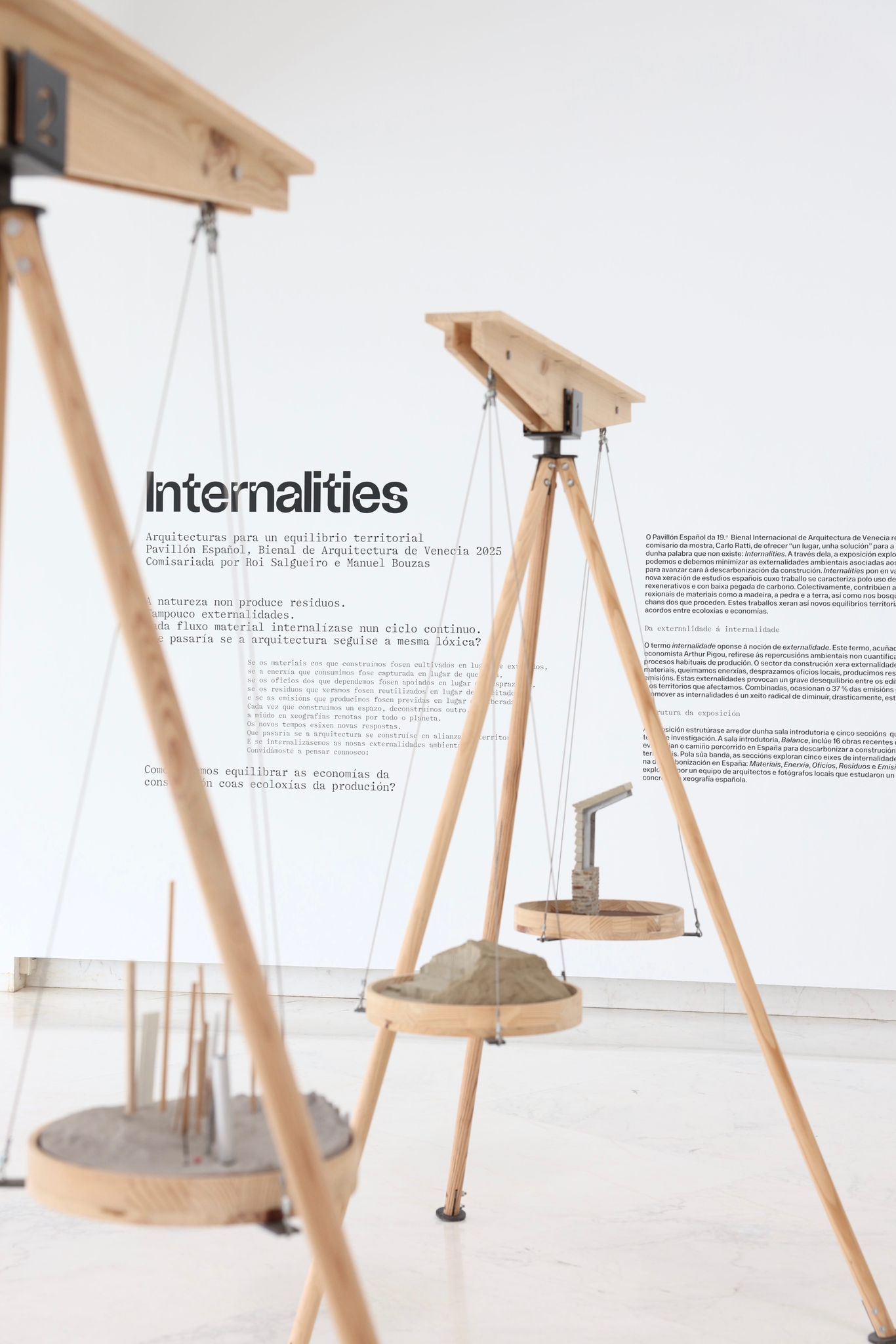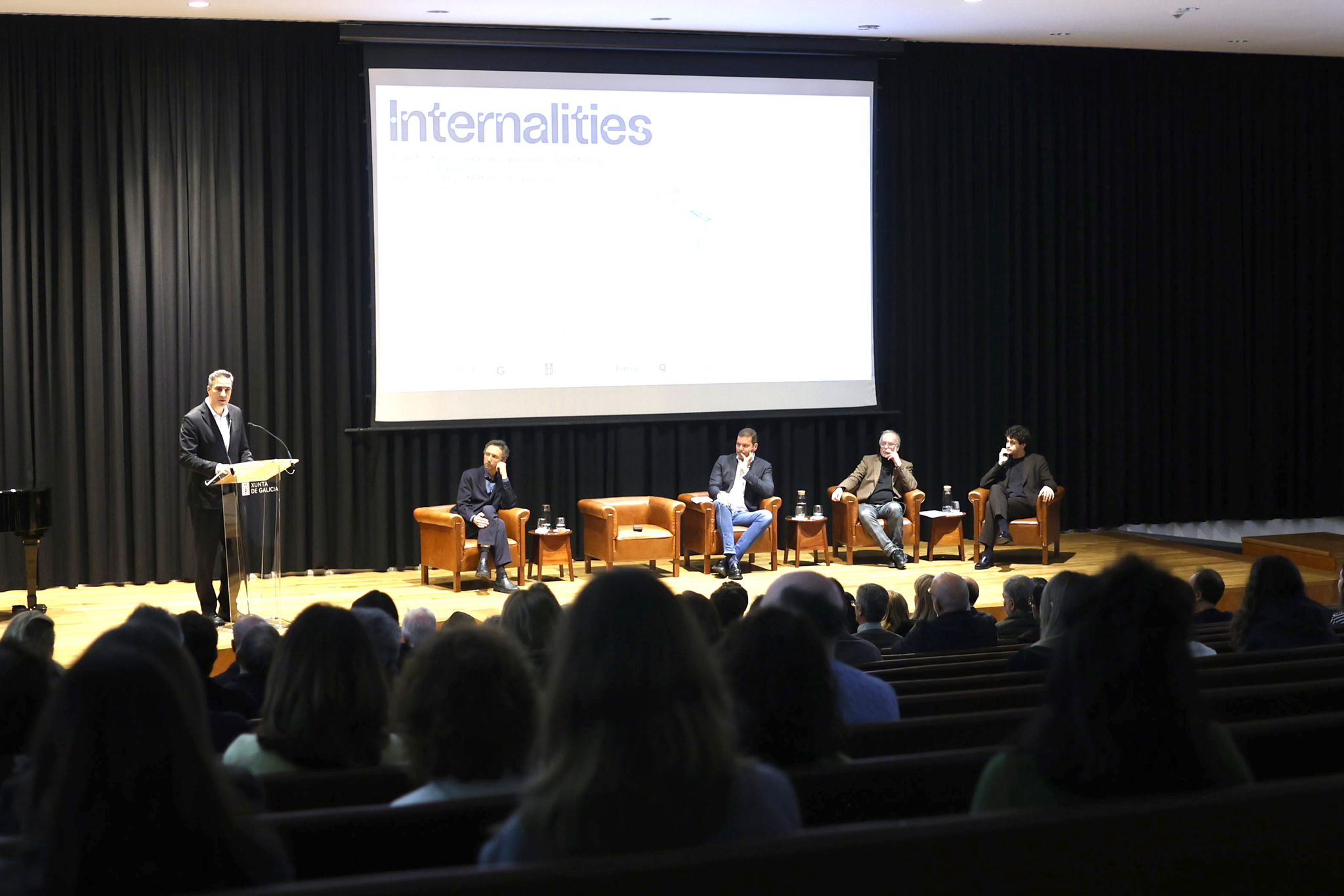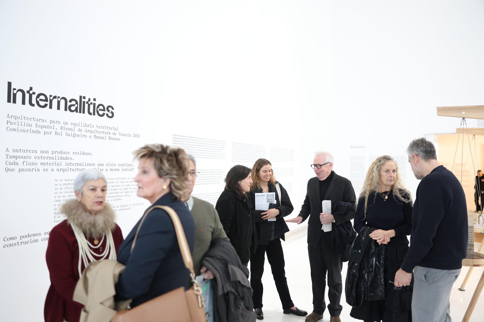 En este contexto, la inauguración de la exposición se acompañó del programa público Internalities para Galicia, que se desarrolló a lo largo de dos jornadas consecutivas (6 y 7 de febrero) con el objeto de conectar los objetivos de descarbonización de la investigación con las condiciones arquitectónicas, económicas y ecológicas de la comunidad autónoma. Las sesiones reunieron a arquitectos, responsables públicos, expertos y agentes sociales para abordar cuestiones clave como la transición energética, la vivienda y la reducción de emisiones, el uso de materiales locales en la construcción y los nuevos modelos de educación y experimentación.