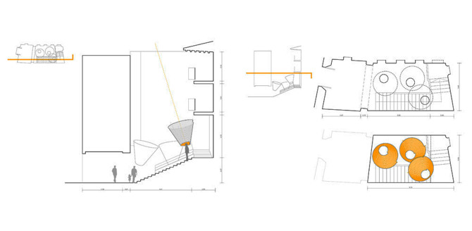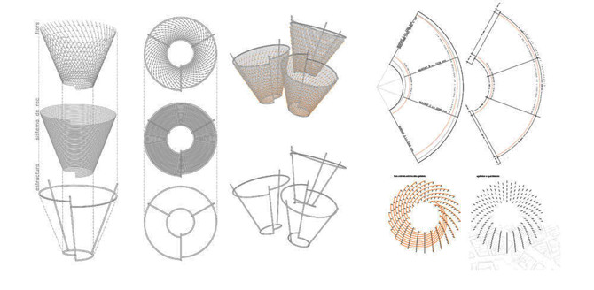 Tras franquear el oscuro umbral abovedado que separa el patio de la calle, el visitante podía asomarse al interior de esos tres cuerpos exentos y percibir la verticalidad del patio. Para ello, su estructura de soporte, formada por tres tubos metálicos a modo de generatrices, se colgó mediante cables. La lógica constructiva de los tres conos se podría asimilar a la de un cesto de mimbre. La ligera armazón servía de urdimbre sobre la que se enrollaba en espiral un tubo de PVC transparente que, además de definir la envolvente exterior, permitía solventar el sistema de riego.