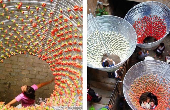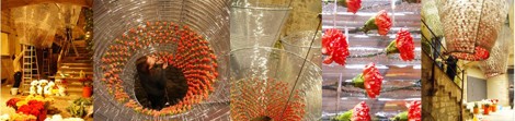 En su interior, siguiendo el desarrollo en espiral, se disponían cientos de claveles cuyos tallos quedaban introducidos en el tubo. El uso del clavel generaba, gracias a su aspecto carnoso, una atmósfera aterciopelada y matricial, en cuyo interior la helicoide de flores dirigía la mirada hacia el retazo cambiante de cielo. Mientras, en su exterior, los conos se mostraban en su geometría tersa y cristalina, a través de la cual solo despuntaban, como una sutil invitación al flâneur, pequeños destellos de color.