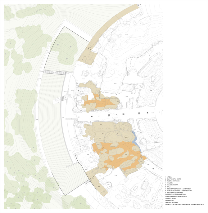 La intervención, muy medida y realizada con una modesta inversión, supone la puesta en funcionamiento del sistema original romano, lo que favorece su mantenimiento y conservación. Las actuaciones se completan con la reorientación de caminos y recorridos –posibilitando la visita pública a través del eje principal del anfiteatro– y el tratamiento superficial de la ladera, reforestada con especies vegetales autóctonas.