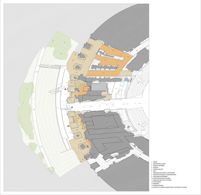 La actuación ha tenido un doble objetivo: de un lado, dar solución al problema hidráulico y de aportes de sedimentos, y de otro, con un criterio de intervención mínima, la consolidación estructural de estructuras y rellenos cuya precaria estabilidad impedía el tránsito público. Al exterior, se rectifican las pendientes de las laderas para aproximarlas al talud natural y se proyecta un nuevo sistema de drenaje concéntrico al edificio que permite encauzar la evacuación de agua –filtrada y limpia– a través de las cloacas romanas.