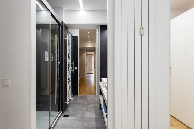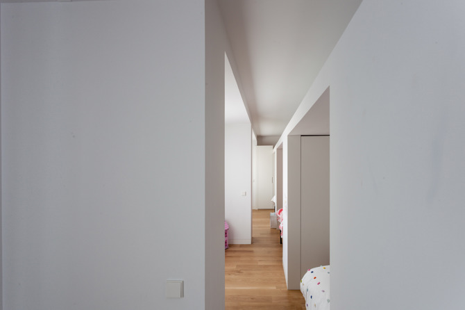 Al hacer que el pasillo deje de ser exclusivamente de paso, conseguimos actividad en todo el espacio de la casa. Dotar a la vivienda de los servicios que ahora no tienen, mejorar su accesibilidad y uso, nos permite alterar la jerarquía de las piezas, y adaptar una antigua vivienda burguesa a las necesidades de una familia actual. La sala de estar recobra en este caso nuevos matices al encontrarse diseminada por la casa. La cocina se convierte en el espacio principal de la vivienda. El comedor y la cocina se unen visualmente aunque no físicamente, reubicados en un lugar principal de la misma. De este modo la parte interior de la casa, ventilada a través de patios de servicio, se destina también a zona de convivencia, reforzando su funcionamiento con una cocina muy abierta y con todo lo que puede suceder alrededor y en la gran mesa.