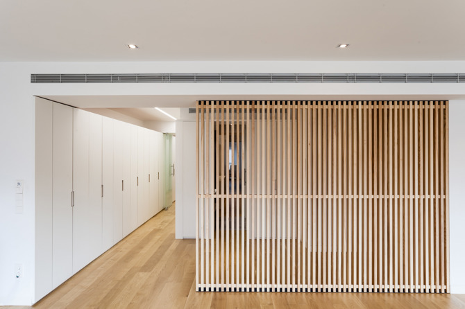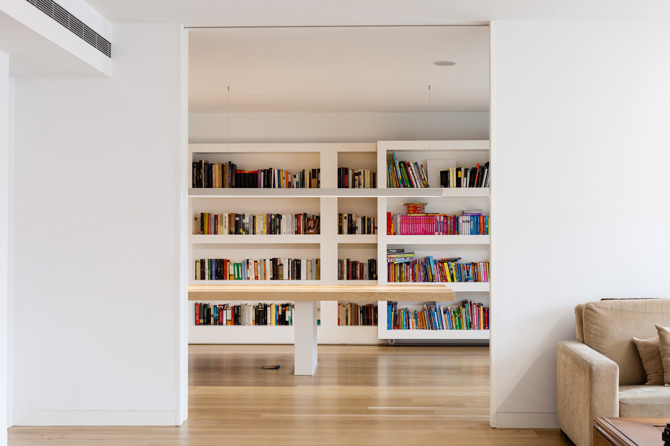 Al colocar en piezas longitudinales el almacenamiento de ropa y comida, algunos electrodomésticos o los aparatos de aseo y limpieza, creamos unas grapas por debajo de las vigas, con las que camuflar o disimular el cuelgue de las mismas al asimilar ambas a volúmenes desplazados y transversales. Con ello conseguimos continuidades espaciales que nos permitían unir o separar sin dificultad, creando visuales a ambas fachadas y recorridos alternativos, al convertir los espacios de paso o servicio, en espacios de otras actividades posibles.