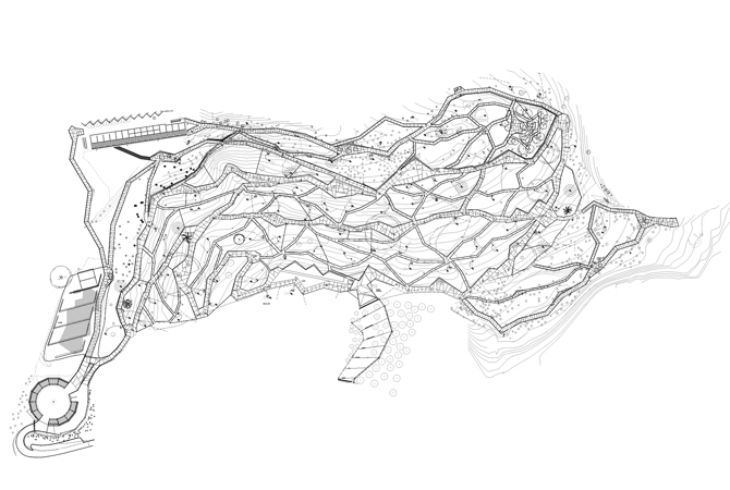 El proyecto propone la utilización de una malla triangular como estructura fundamental, lo que permite diversificar las orientaciones con el mínimo movimiento de tierras; también facilita la creación de microclimas locales que permitan distribuir las unidades de vegetación de acuerdo con sus necesidades ecológicas y la orientación de las perspectivas en cada punto del jardín.