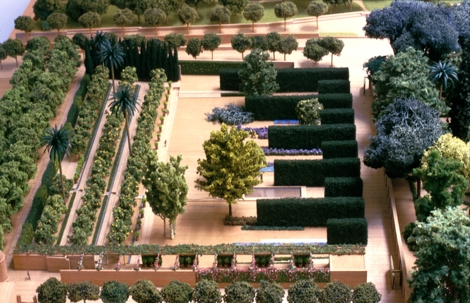 La estructura geométrica del jardín sugiere la racionalidad de un espacio de colección vegetal, cuyo trazado quedará difuminado por la propia vegetación, aportando esta la componente más próxima al mundo de las sensaciones. En el lado de poniente, tres terrazas longitudinales decrecientes en altura, albergarán las colecciones de cítricos, siempre acompañadas por recorridos del agua que mana de una fuente escondida entre los árboles, y de los setos aromáticos. En el sur, una pérgola acompaña al acceso, y por levante se alzan los muros de ciprés recortado, como secuencias visuales sobre el cierre del Botánico, coronado por el magnífico perfil de las copas de su arbolado. El espacio central del jardín se configura como una explanada desde la cual el espectador puede asistir al espectáculo de las diferentes imágenes vegetales y escultóricas y contemplar los episodios del referente argumental: el árbol de los frutos de oro, las esculturas de las ninfas y su metamorfosis en árboles, la escultura del héroe o el fantástico dragón, también metamorfoseado en serpiente.