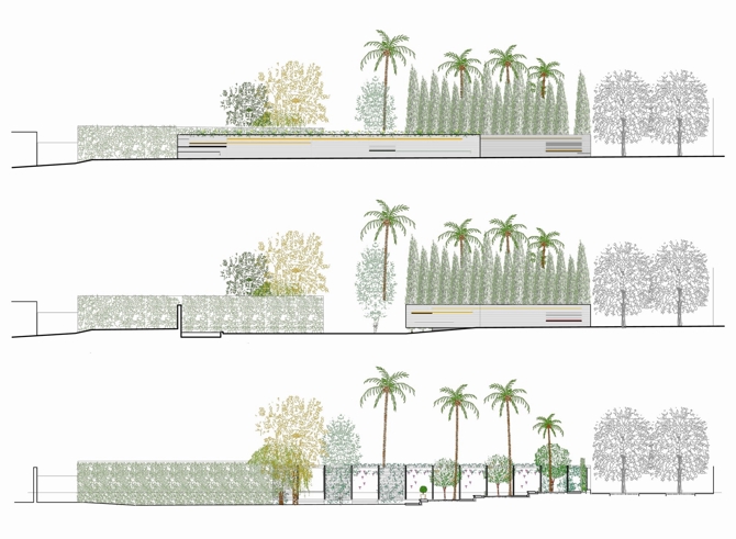 Jardín aterrazado dispuesto sobre piezas prefabricadas de hormigón, solados naturales de tierra para plantación y espacios de aterrados de suelo absorbente acabado en testillo cerámico, piezas de mármol y esculturas de bronce.