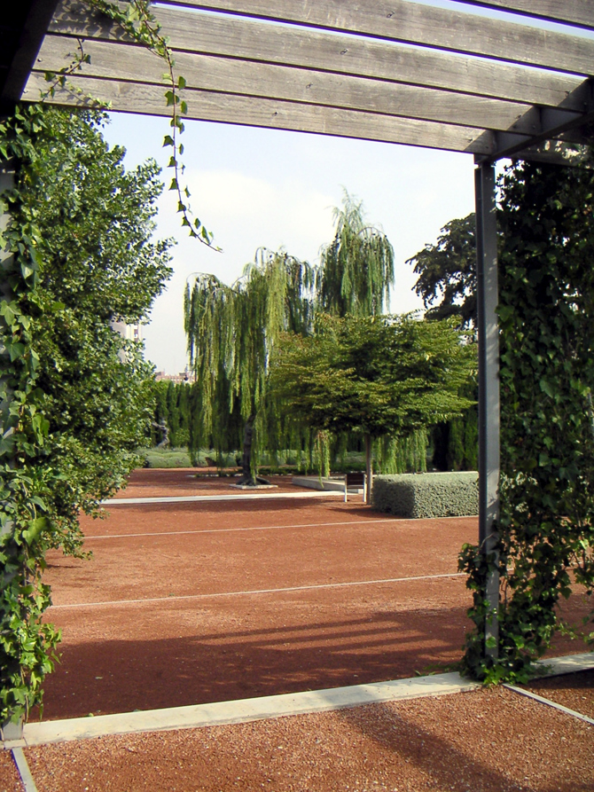 El Jardín de las Hespérides se propone como un “hortus conclusus” cuyo cerramiento se abre puntualmente, a modo de guiños, que sugieren al transeúnte la posibilidad de entrar en el mundo diferente del espacio ajardinado.