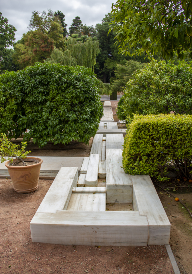 El Jardín de las Hespérides se propone como un espacio cerrado, donde el relato mitológico ha servido de hilo argumental y se ha interpretado por medio de diferentes especies vegetales y esculturas. Con el telón de fondo de los muros de ciprés intermitentes, la presencia de agua que mana de la fuente acompaña en su recorrido a una completa colección de cítricos representada por 50 variedades diferentes.