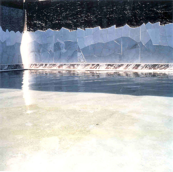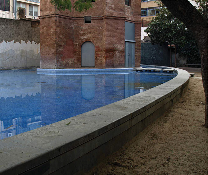 Un banco corrido con una fuente en el extremo enfatiza el agua como elemento de juego. El pavimento de cerámica y el mosaico de mármol de colores en las paredes perimetrales le otorgan un carácter intimista. En verano el estanque y el jardín se transforman en la playa del Ensanche donde los niños juegan, meriendan y se bañan.