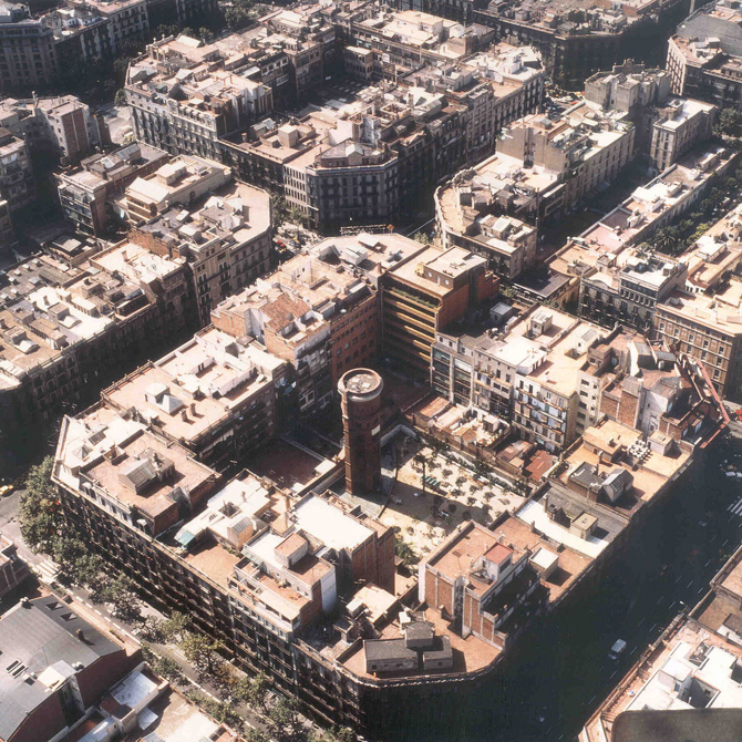 La entrada por la calle Roger de Llúria 56 se hace por una puerta de hierro forjado y se entra a través de un pasaje cubierto que lleva al patio central. El nuevo jardín reconoce en su composición la singularidad de la Torre de les Aigües, que abastecía a este sector de la ciudad a inicios del siglo XX. La torre está rodeada por un estanque y el otro lado se encuentra sombreado por magnolias.